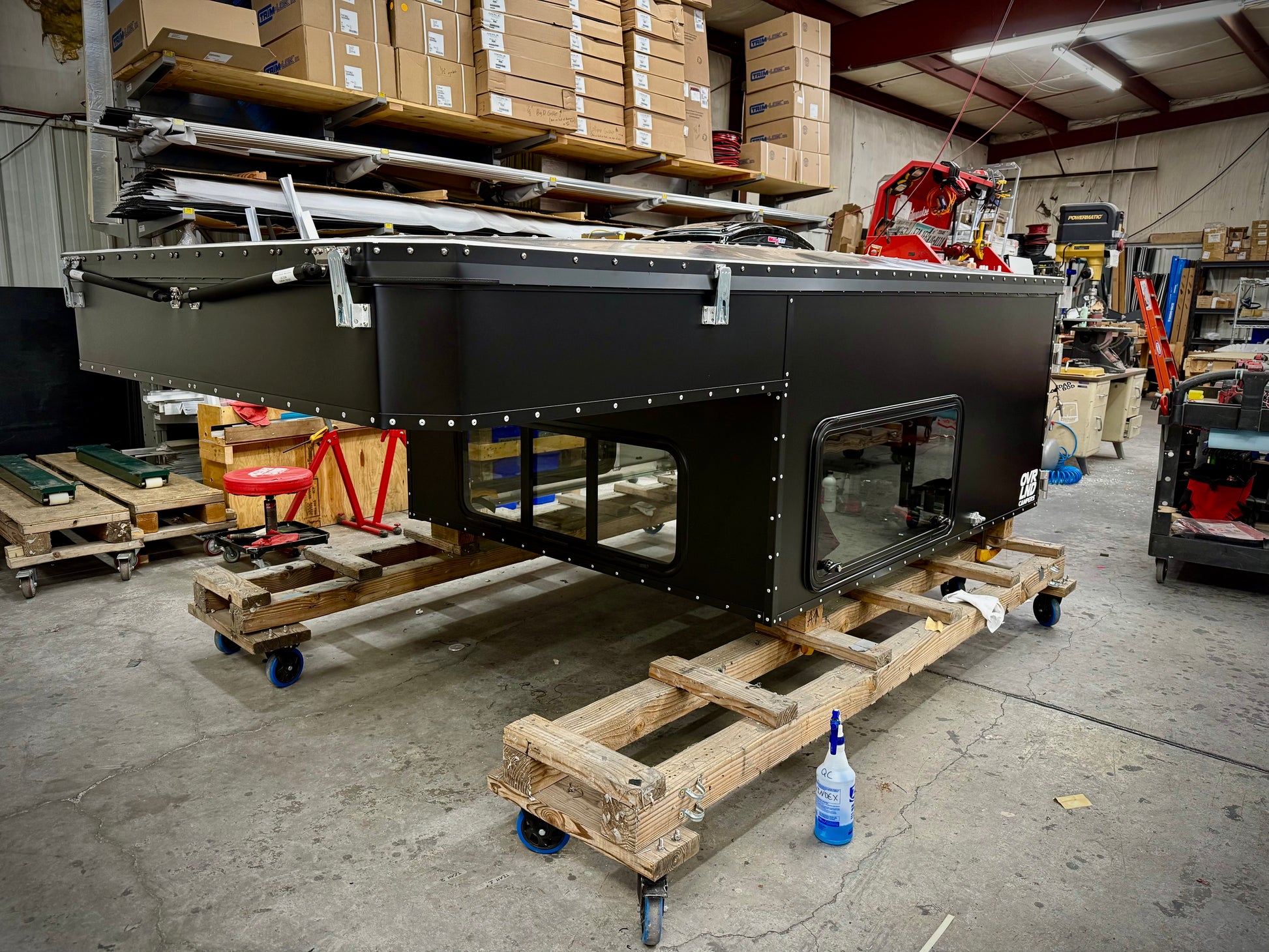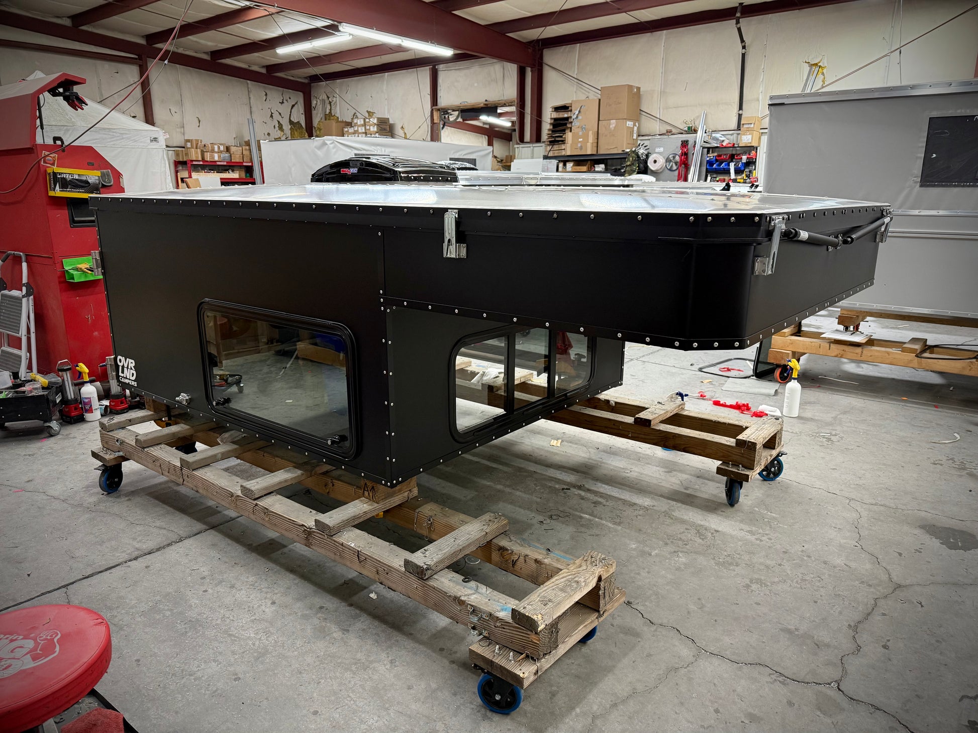An All You Can Eat camper for a Second or Third Gen Toyota Tacoma with a 6' bed (2005-2023), with Matte Black Painted Skins. Brand new and ready to go. This camper comes with a Maxxair Deluxe Fan and has cargo access on both sides of the camper. See full list of features below.