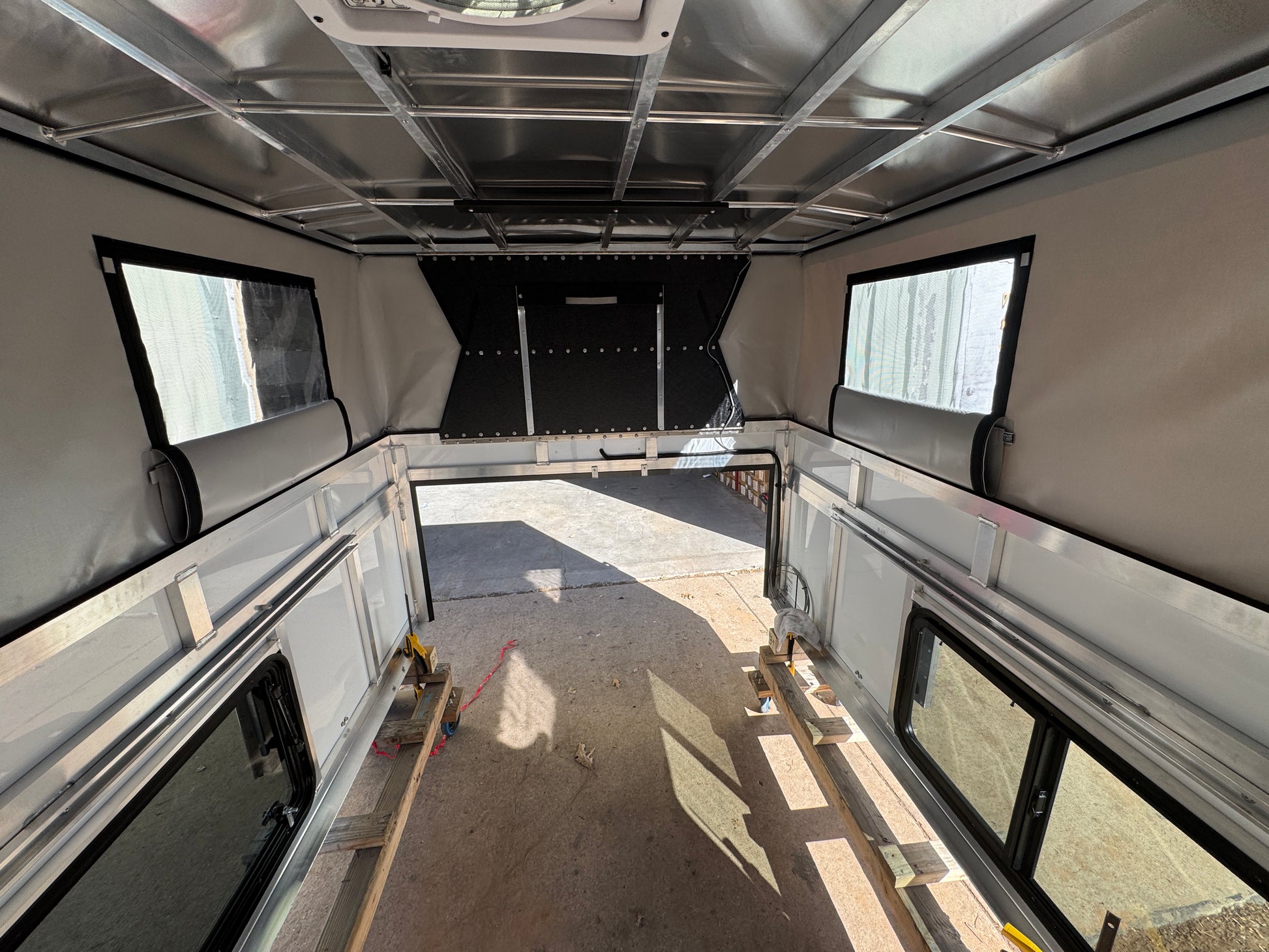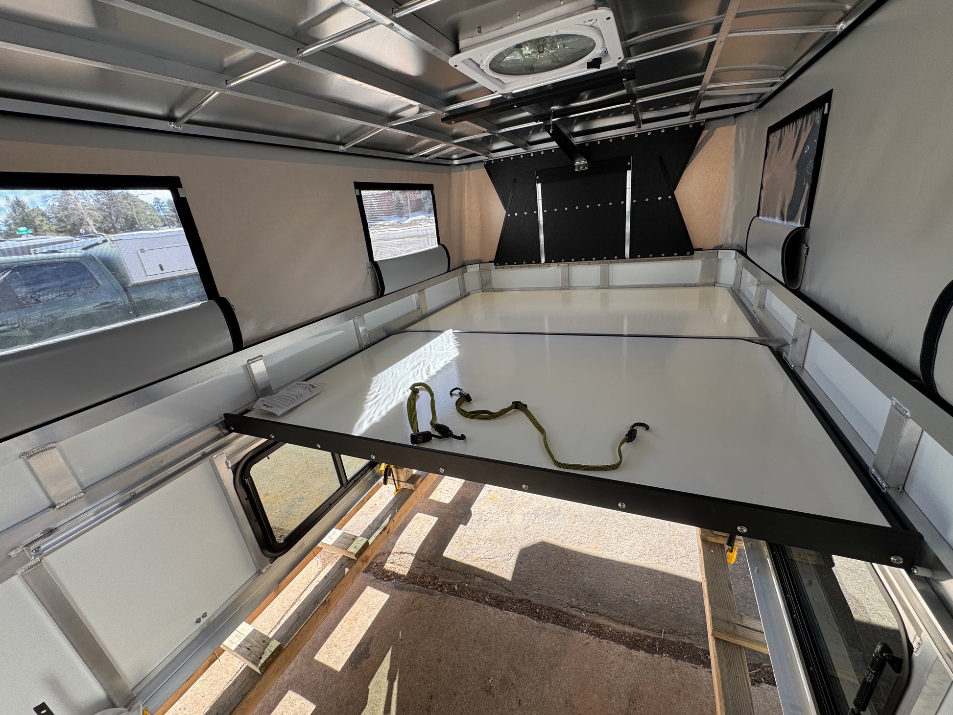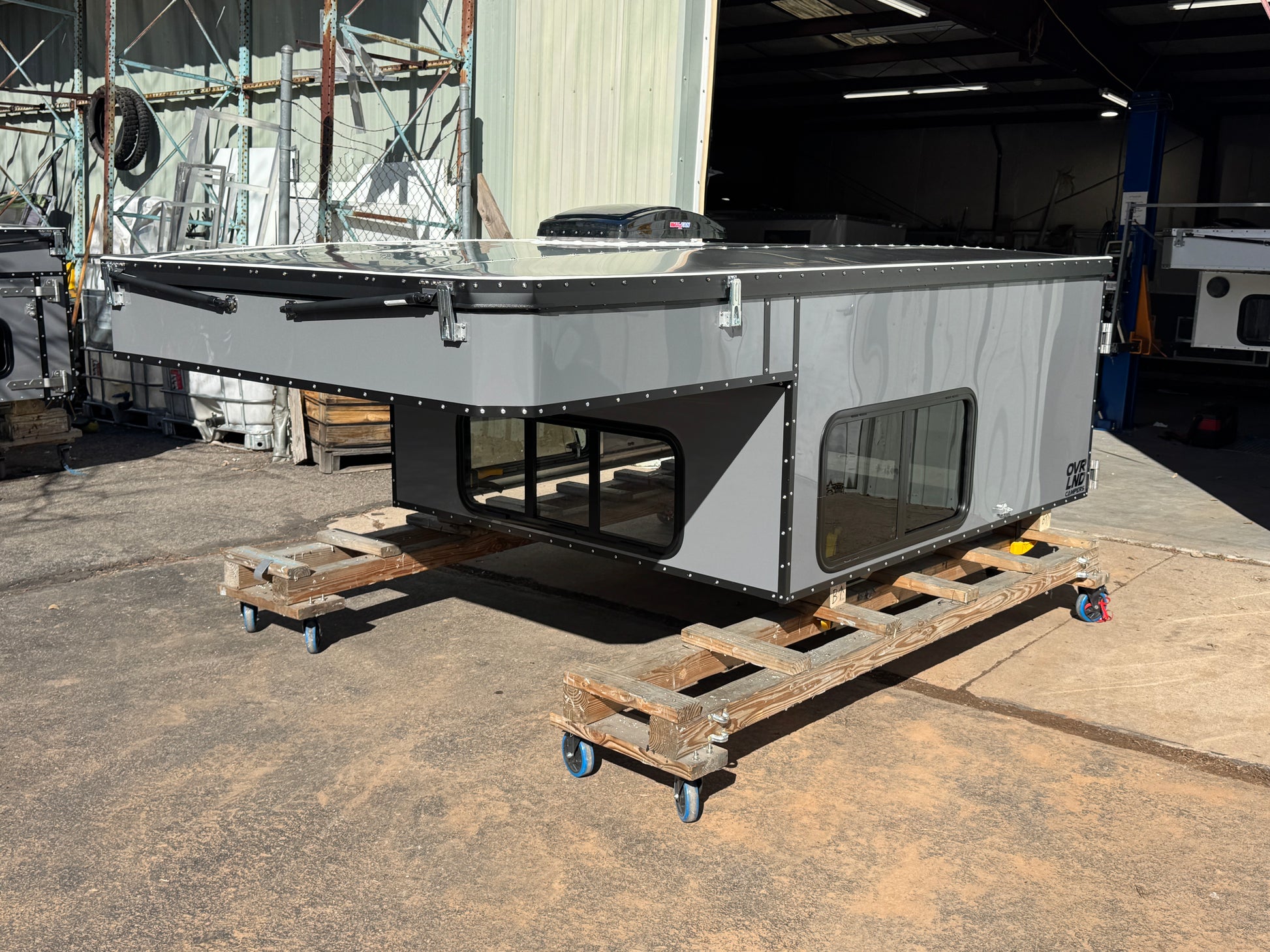 An All You Can Eat camper that fits a Toyota Tundra (2014-2026) or a Ford F150 (2015-2026), with Painted Gray Aluminum skins and Painted Black Trim. Brand new and ready to go. This camper comes with a Maxxair Deluxe Fan and windows all around. See full list of features below.