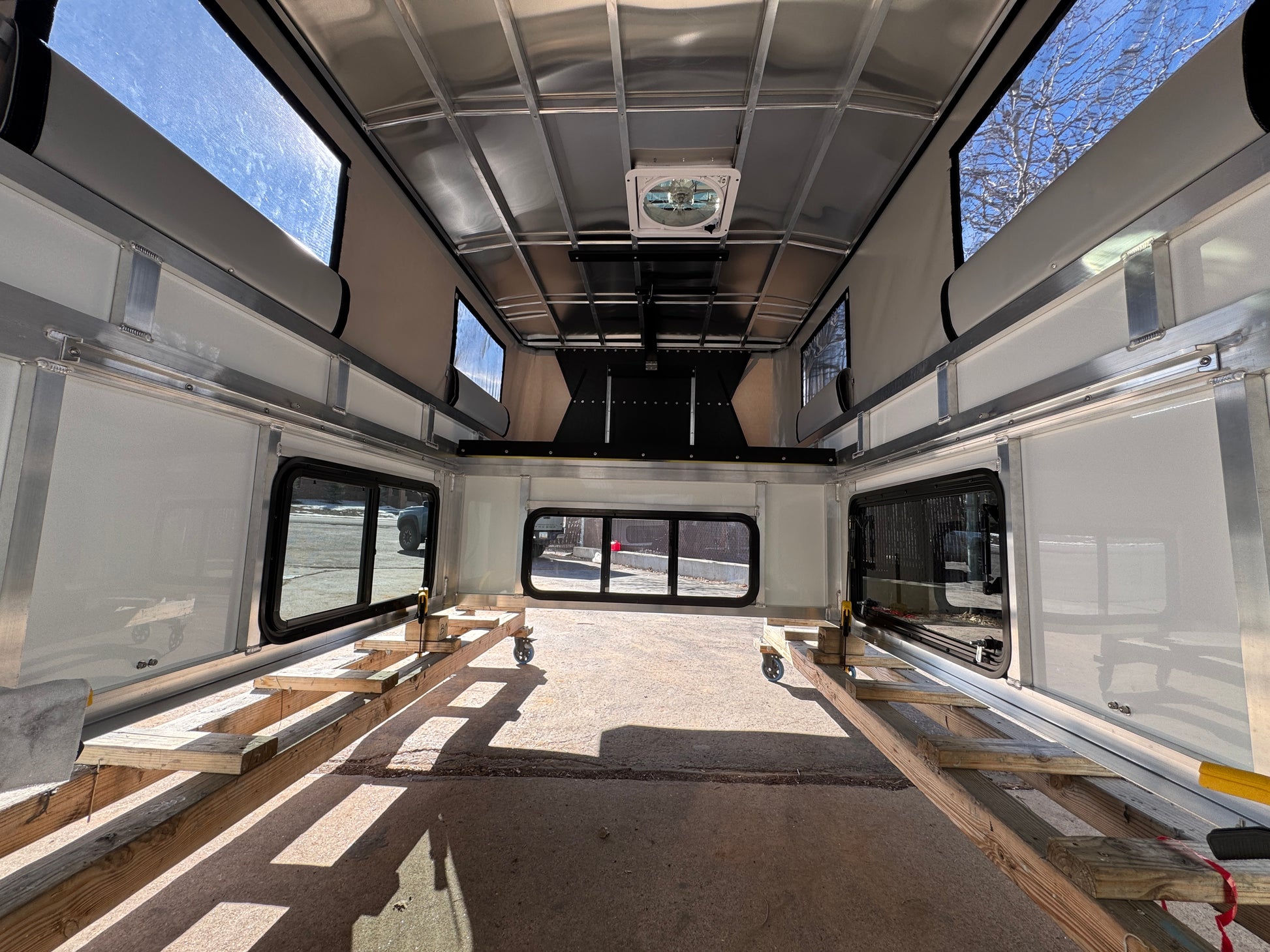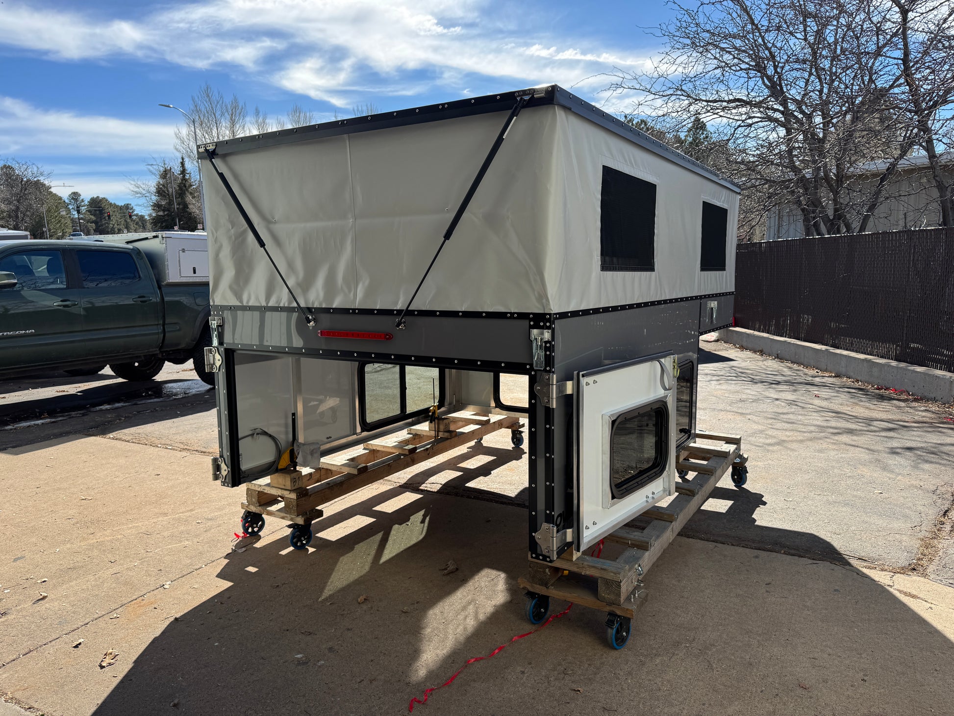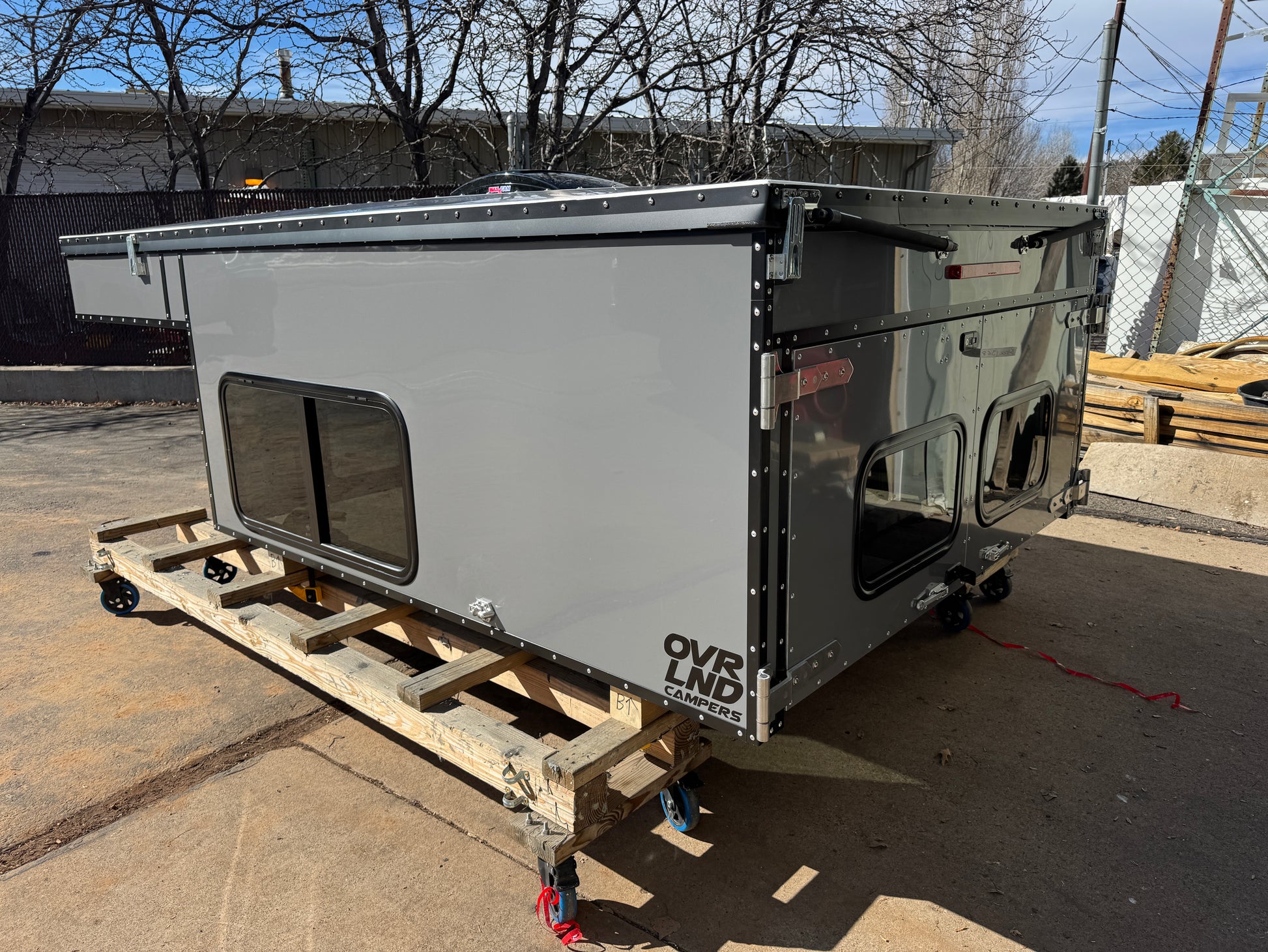 An All You Can Eat camper that fits a Toyota Tundra (2014-2026) or a Ford F150 (2015-2026), with Painted Gray Aluminum skins and Painted Black Trim. Brand new and ready to go. This camper comes with a Maxxair Deluxe Fan and windows all around. See full list of features below.